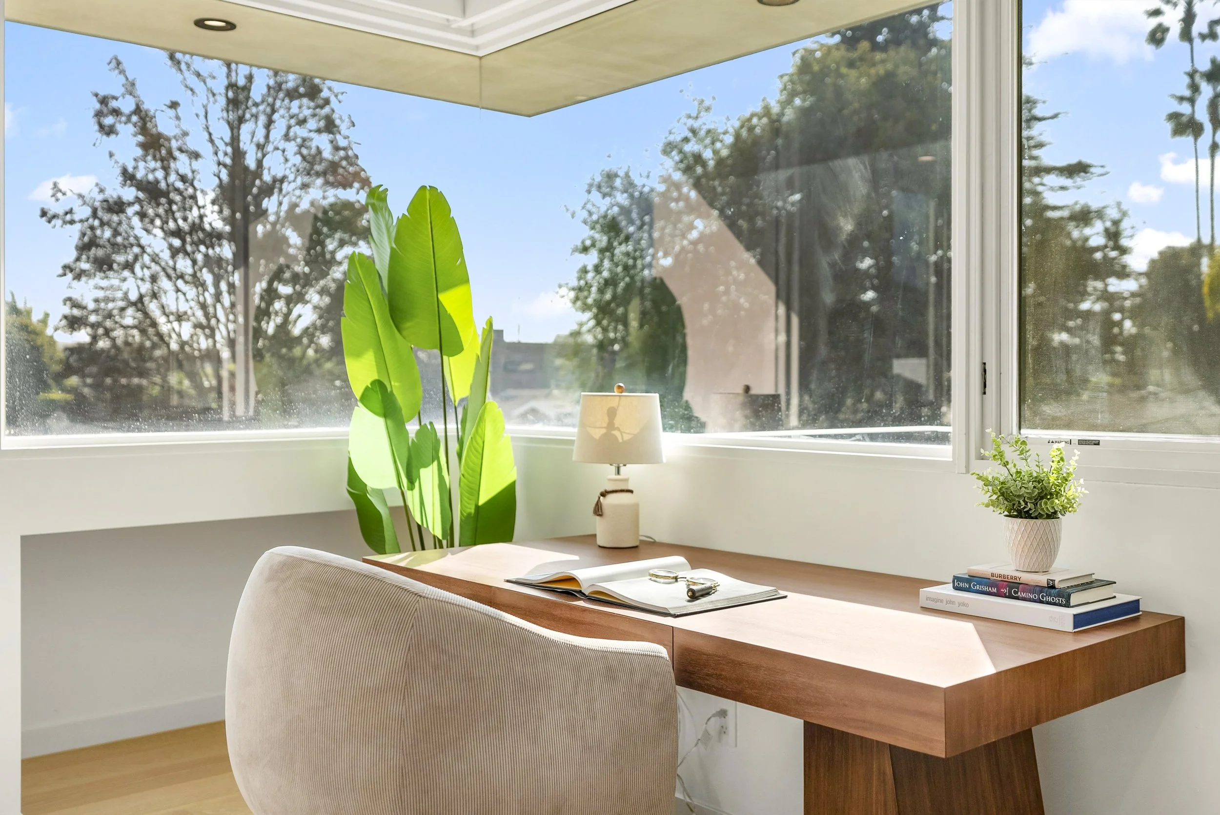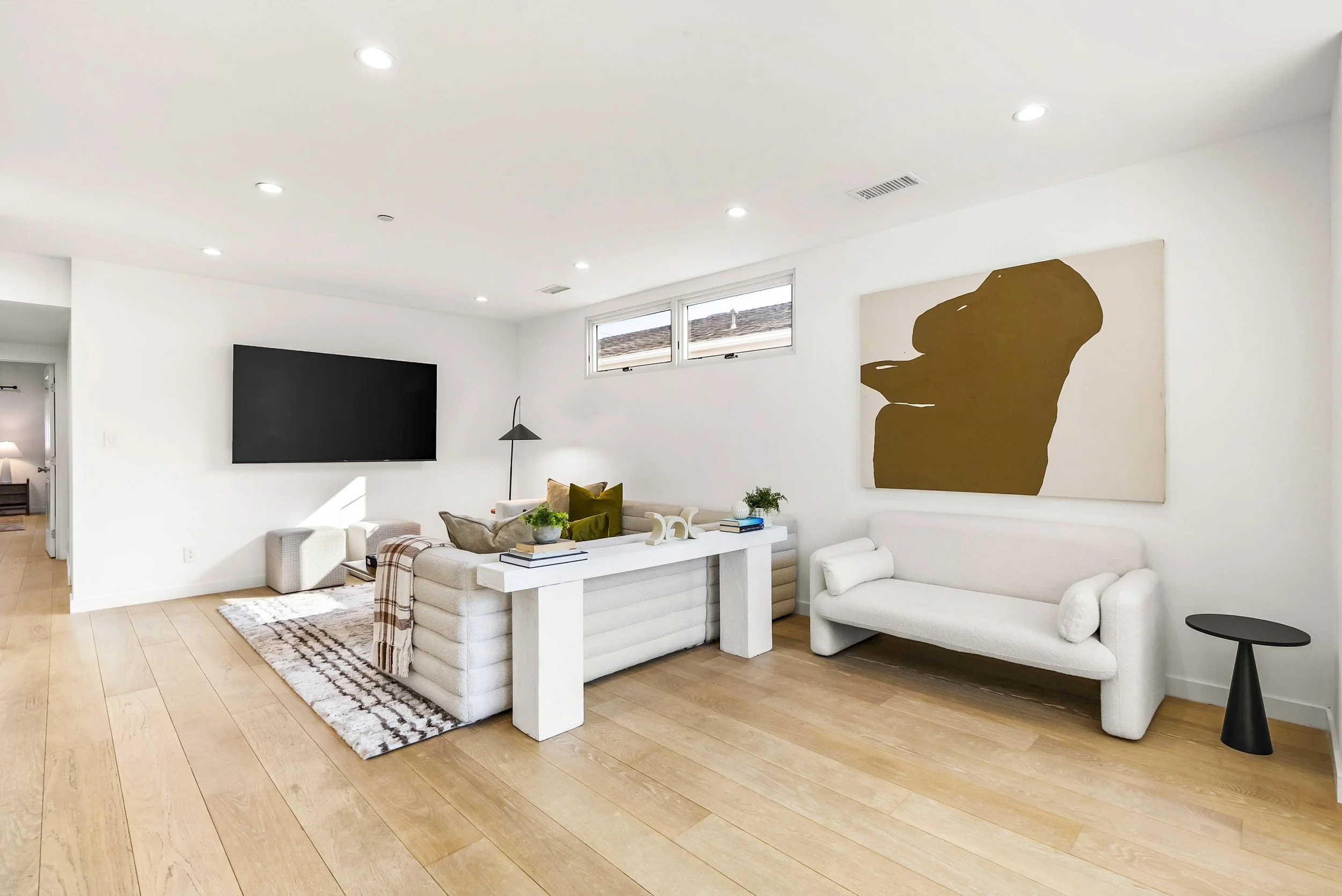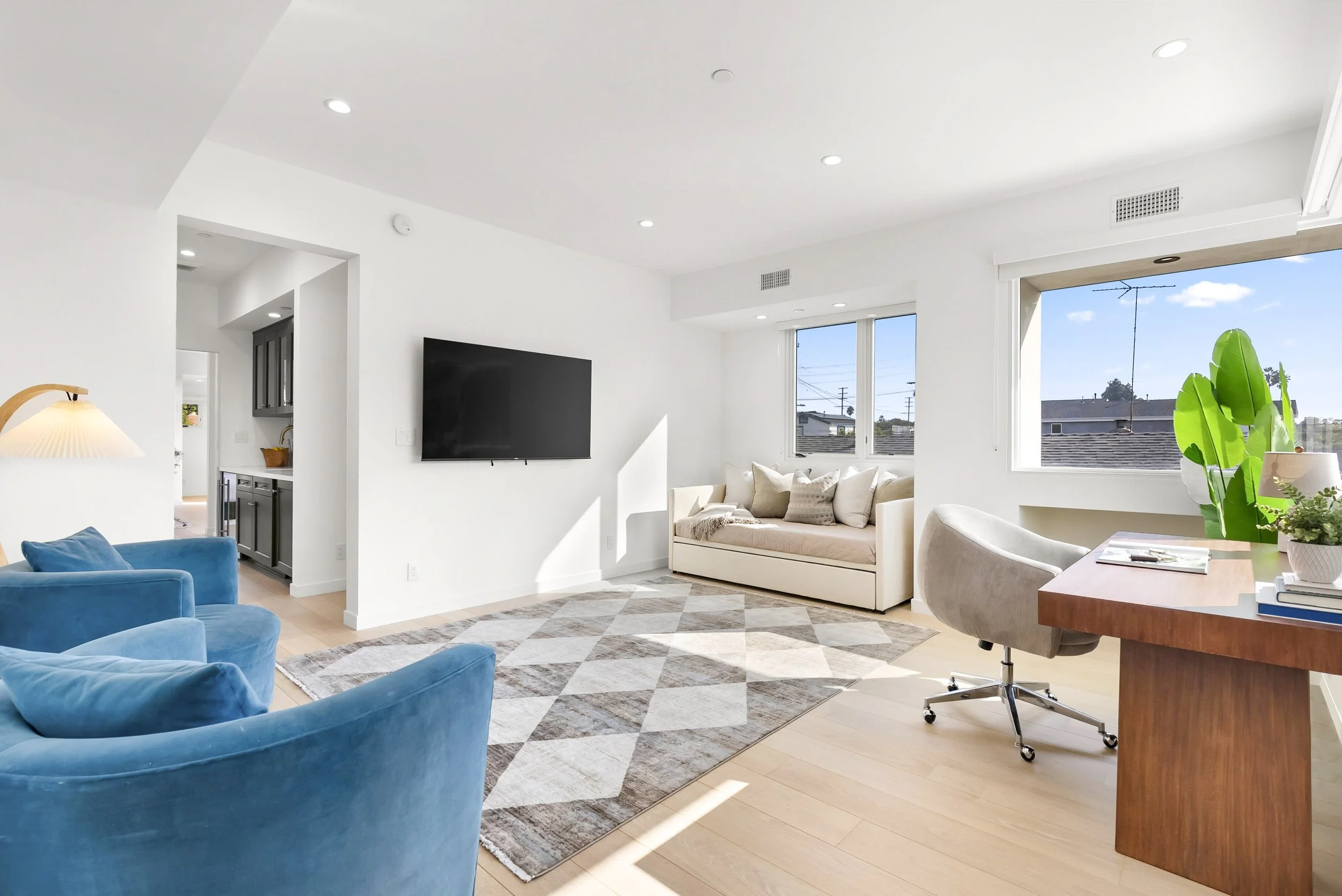 A large open den that serves as a fourth bedroom or an office. Enjoy a king-sized daybed with a plush memory foam mattress, a dedicated desk area and a 65-inch TV