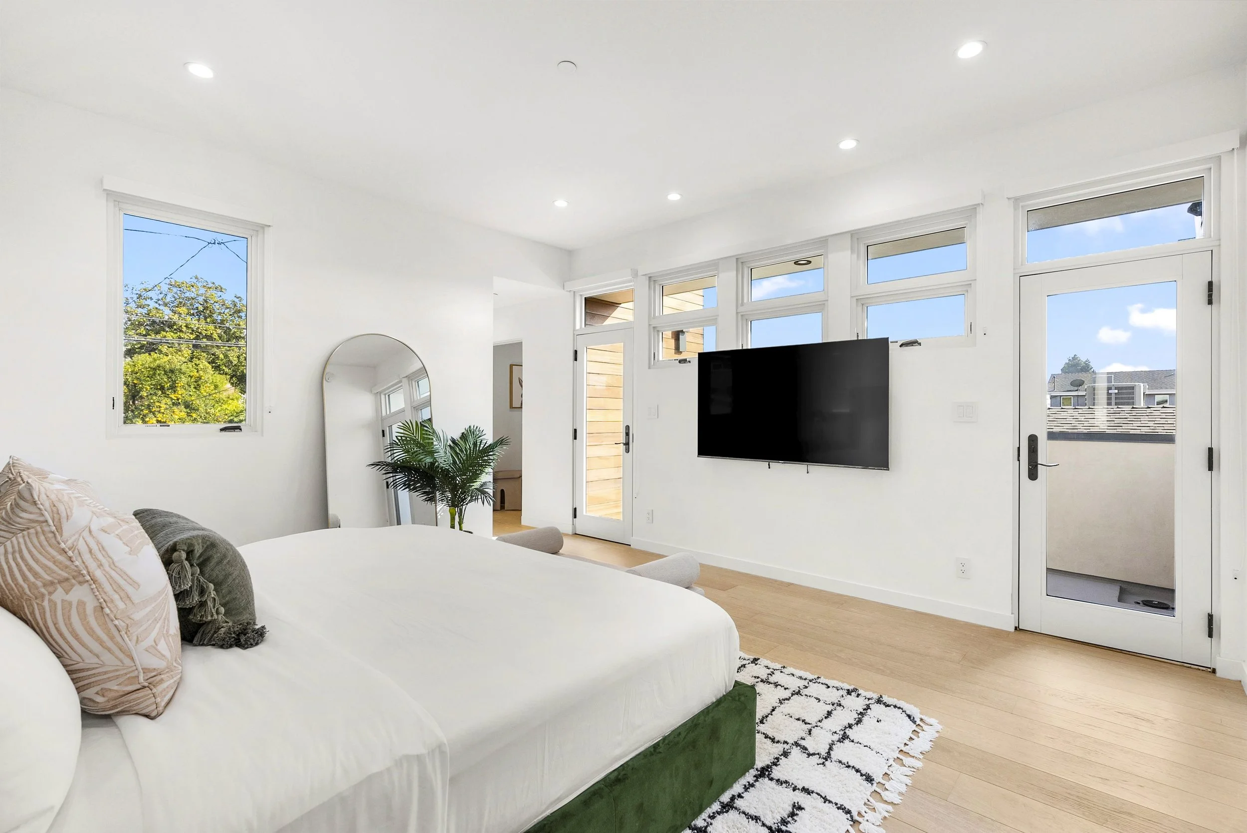 A large primary suite with a luxurious king bed, walk-in closet, furnished private patio, and a spacious ensuite bathroom (complete with a dual vanity, extra-large shower, smart bidet toilet and free-standing soaker tub)