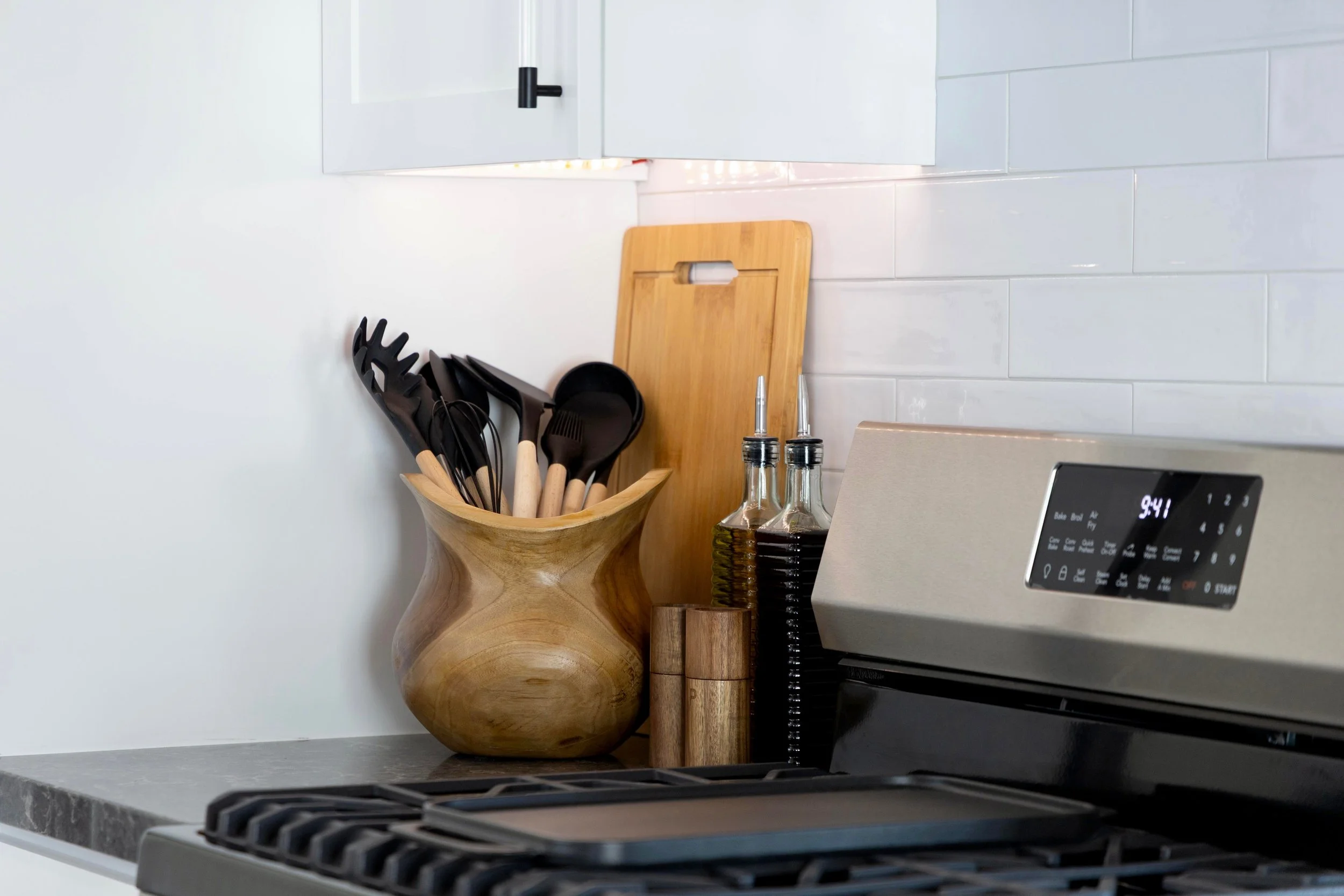 A fully-equipped kitchen with brand new stainless steel appliances. Enjoy a wide variety of cookware and utensils, an air fryer, coffee three ways (Nespresso machine, french press and drip), and more